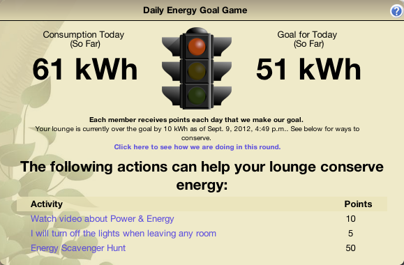 Feedback is an important part of the Kukui Cup, and (for example) the Daily Energy Goal Game is designed to help motivate players to act on the feedback provided by the system regarding their energy consumption. Here is a screenshot of the Daily Energy Goal Game user interface: